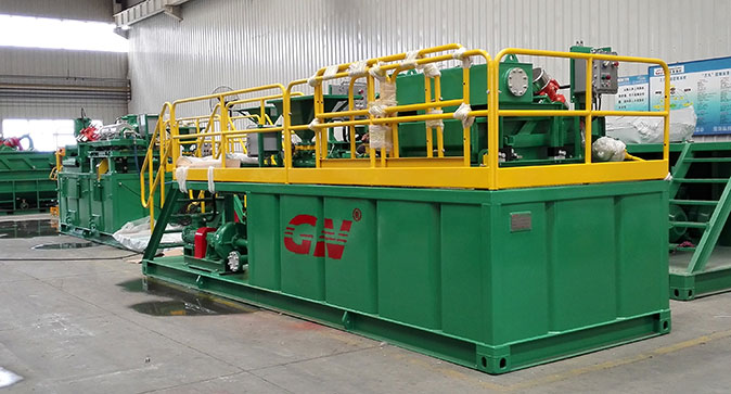 泥漿固控系統中的主體設備 本套泥漿固控系統的主體分離設備為一臺GNZS752新型泥漿振動篩和一臺GNLW223臥螺式沉降離心機。經過以上兩臺分離設備的處理后,可以將泥漿中的細小顆粒分離出來,從而得到凈化的泥漿。加裝一臺射流混漿料斗和混合泵以后,就可以完成井隊泥漿的混配。客戶只要再匹配一臺發電機就可以實現泥漿固控系統的施工。